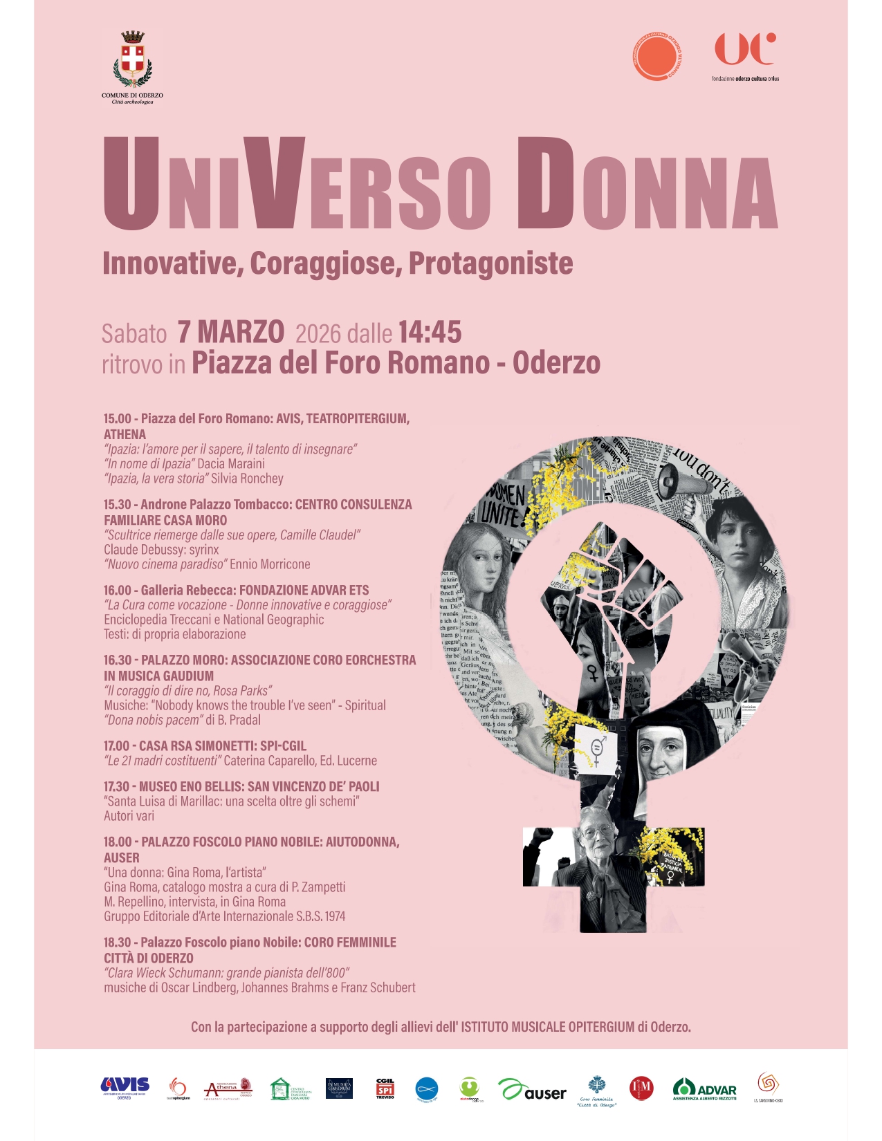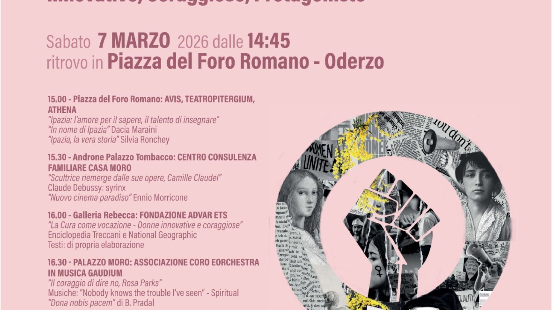 Sabato 7 marzo dalle ore 14:45, con ritrovo in Piazza del Foro Romano a Oderzo, prende il via un percorso itinerante dedicato all’universo femminile. Un pomeriggio tra parole, musica e arte che attraversa alcuni dei luoghi più significativi della città, racconta storie di donne innovative, coraggiose e protagoniste del loro tempo.