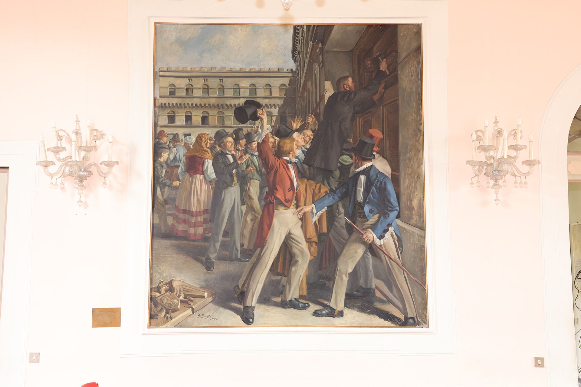 3) 11 Risorgimento: figura dominante il poeta Francesco Dall’Ongaro. Il dipinto ricorda la figura del Prete, poeta, commediografo e grande Patriota Francesco Dall’Ongaro nato a Tremescque di Mansué, distretto di Oderzo, nel 1808 Egli compi i suoi primi studi a Oderzo. Prese parte ai moti di Venezia e poi a quelli di Roma dal 1848-1849 quale aiutante di Garibaldi, fu deputato alla Costituente e quindi in esilio fino al 1859 Il quadro lo rappresenta durante l’insurrezione romana mentre toglie ad un palazzo d’ambasciata a Roma lo stemma dell’aquila bicipite imperiale e colloca il leone di San Marco simbolo di italianità e libertà. Dopo l’esilio fu professore di letteratura a Firenze e quindi a Napoli ove mori il 9.1 1873