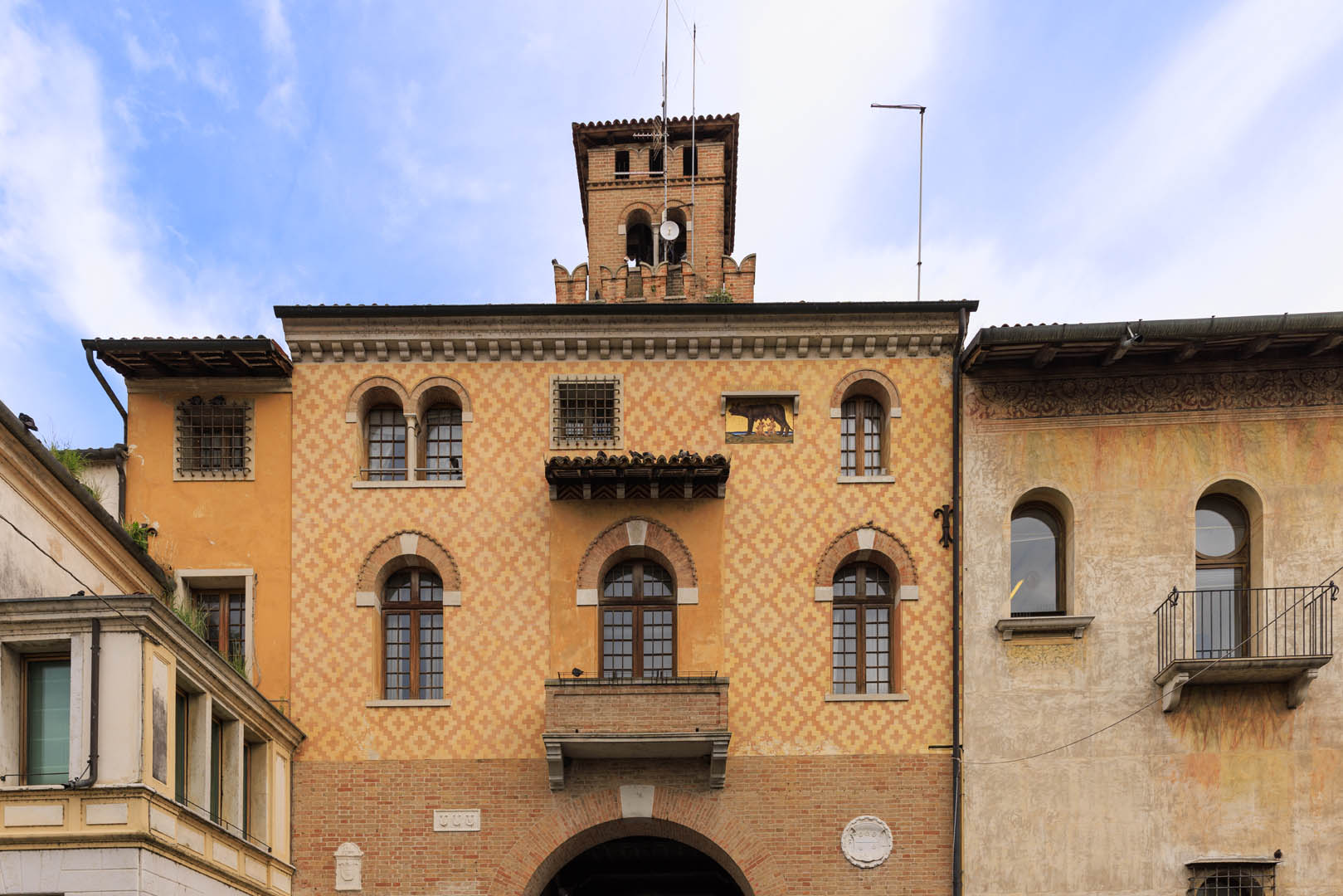 Rimaneggiato nel XIX sec., il Torresin mantiene sulla parte destra, all’altezza della volta dell’arco, tre stemmi nobiliari che ricordano la fondazione del Monte di Pietà opitergino, che aveva la sua prima sede dove oggi c’è una banca. Nel lato opposto vi è lo stemma della famiglia Loredan, che diede alla città diversi podestà. A ridosso del tetto, una lupa probabilmente fa riferimento a quando Oderzo era Municipio Romano. Verso la piazza c’è un orologio, mentre le decorazioni sul lato di Via Umberto sono imitazioni di affreschi parietali a tappezzeria, fatti in epoca recente.